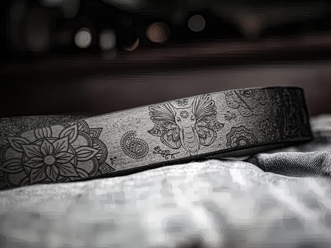 The engraving is done with high-precision laser equipment, then refined by hand to preserve slight irregularities and the trace of the maker. The composition is built around the mandala – the geometric center of the belt. It sets the rhythm and structure. The image of Buddha is positioned to guide attention inward, creating a sense of calm. Nearby is Ganesha, a symbol of resilience and auspicious beginnings. He introduces a sense of motion, balancing the contemplative elements. Between them are the symbols of chakras, Om, the lotus, and samsara – all woven into a unified composition.