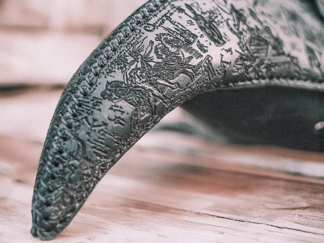 The mask is handmade from vegetable-tanned leather. Each stage – from cutting to the final wax treatment – was completed with long-term perception in mind. The engraving was applied densely, with careful detailing. This piece is constructed as a system of signs open to interpretation. It offers no single reading – only structure and rhythm, inviting the viewer to slow down and study. Every visual element is part of a completed form.