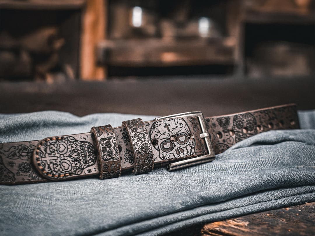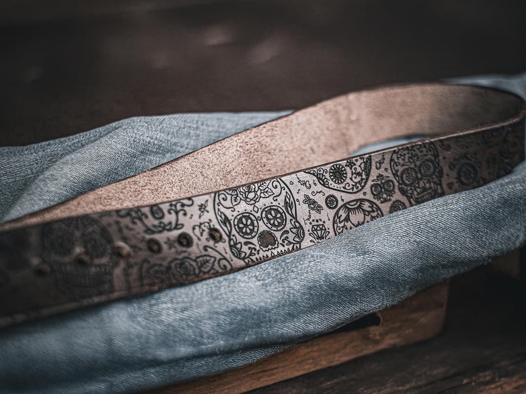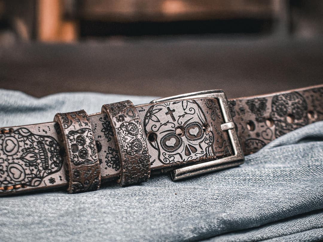 Leather Belt with Engraving Inspired by Día de los Muertos