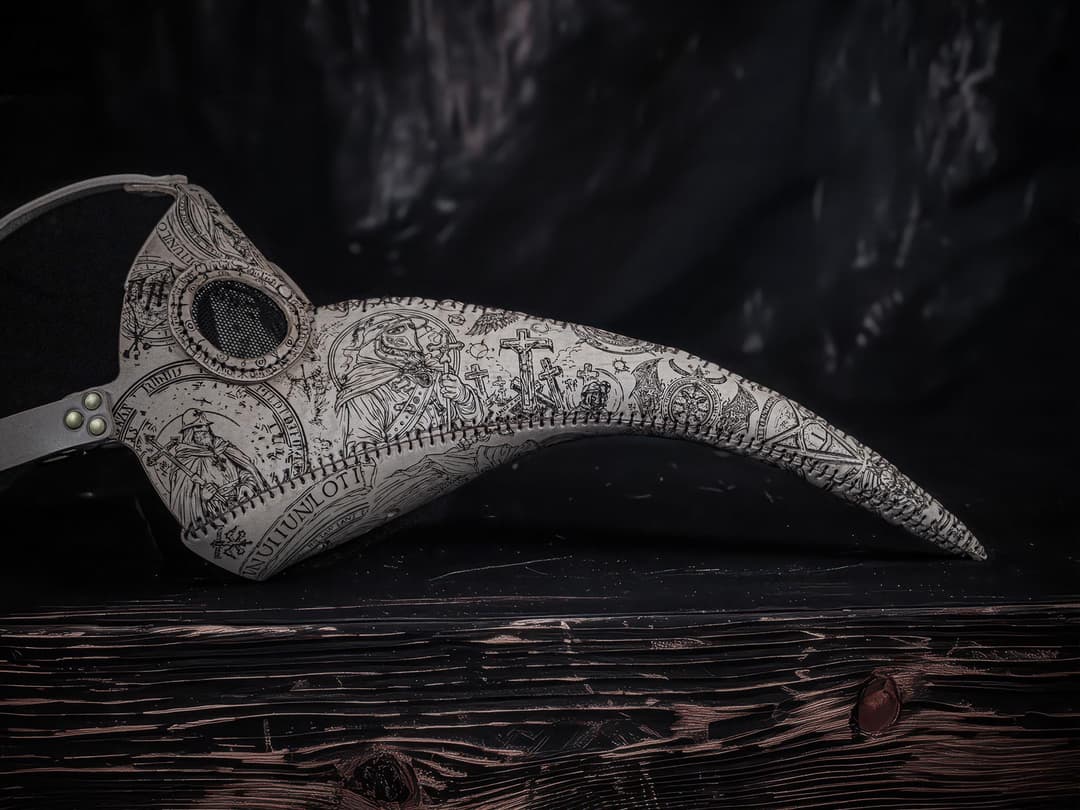 The mask reproduces the appearance of a physician appointed by the Catholic Church during times of plague. It is based on a 1668 manuscript and conveys the symbolism of spiritual duty, where healing gives way to ritual presence and silent witnessing.