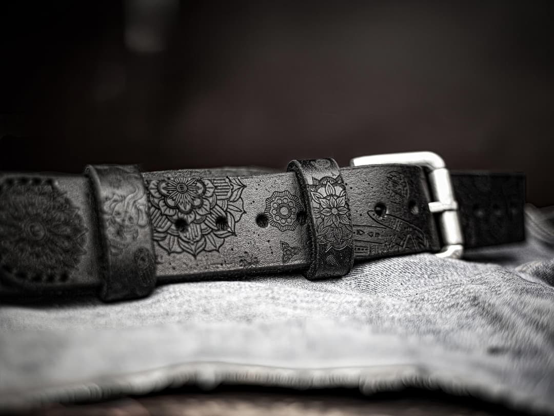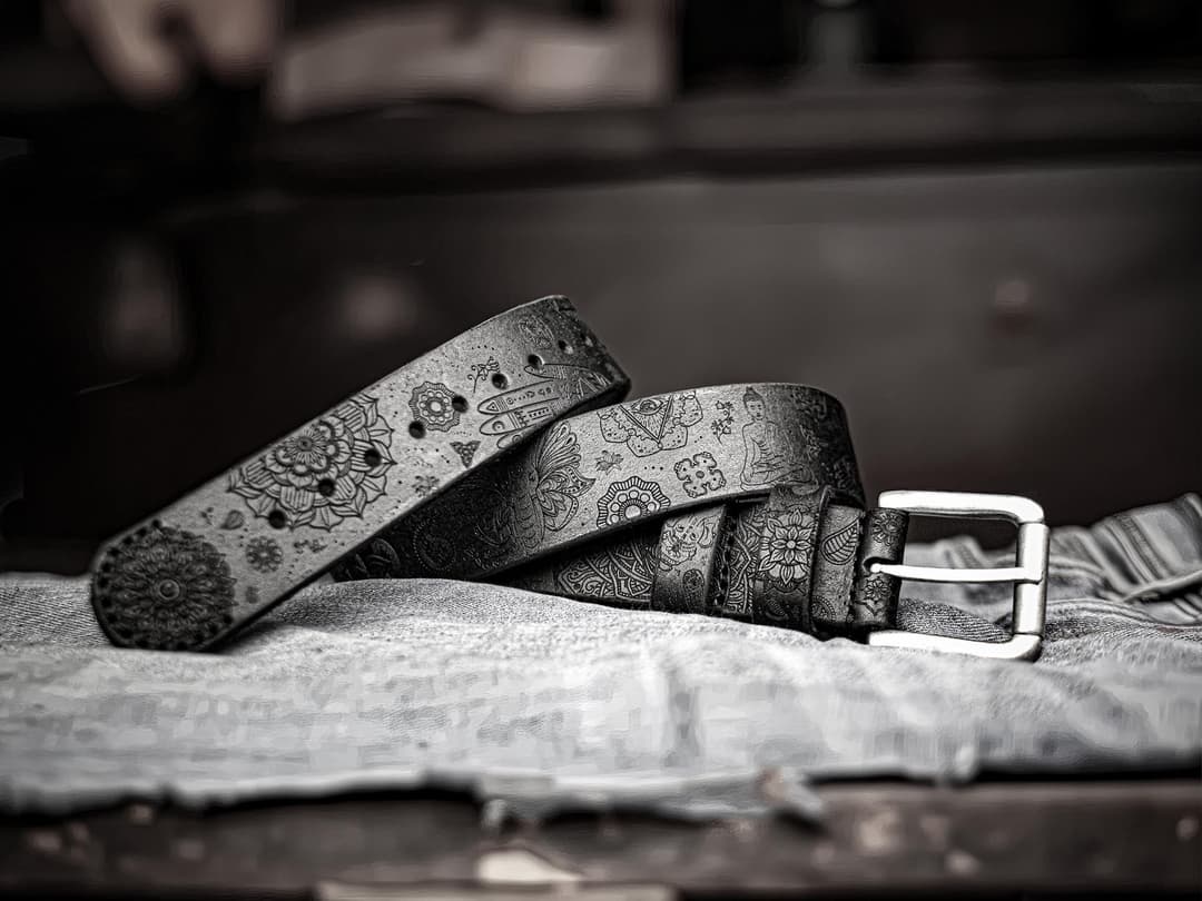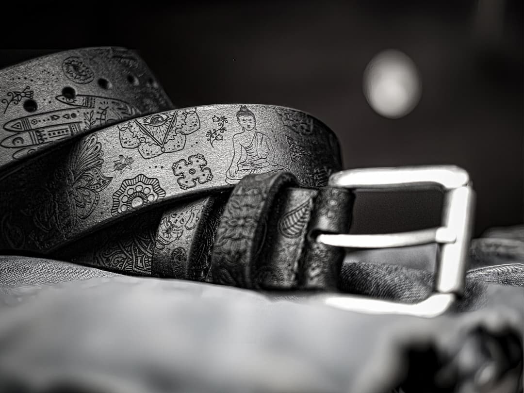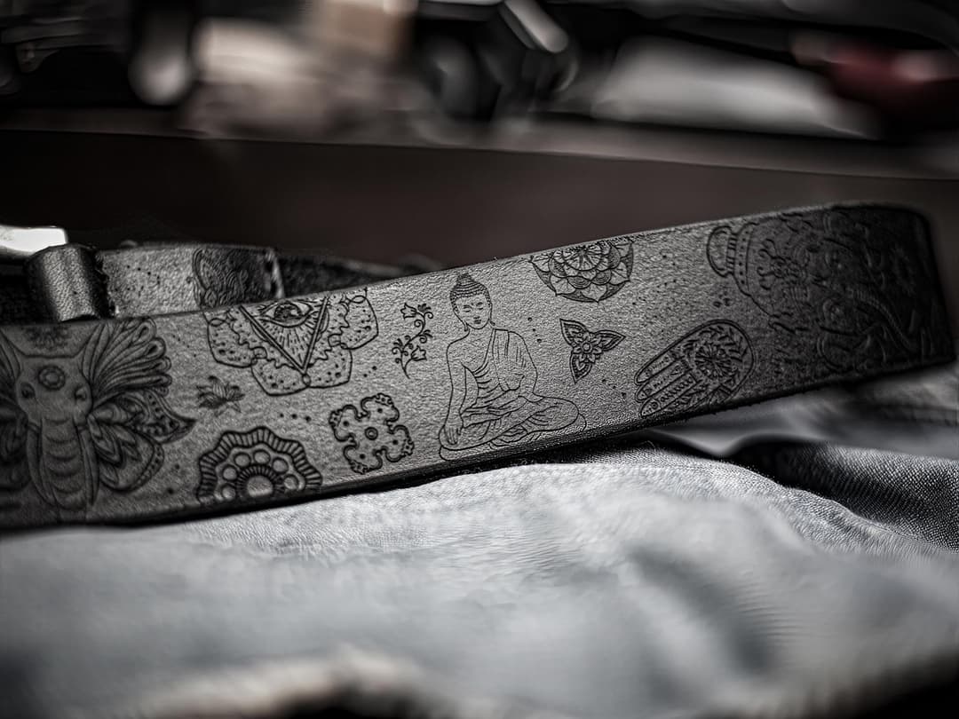 The engraving is done with high-precision laser equipment, then refined by hand to preserve slight irregularities and the trace of the maker. The composition is built around the mandala – the geometric center of the belt. It sets the rhythm and structure. The image of Buddha is positioned to guide attention inward, creating a sense of calm. Nearby is Ganesha, a symbol of resilience and auspicious beginnings. He introduces a sense of motion, balancing the contemplative elements. Between them are the symbols of chakras, Om, the lotus, and samsara – all woven into a unified composition.