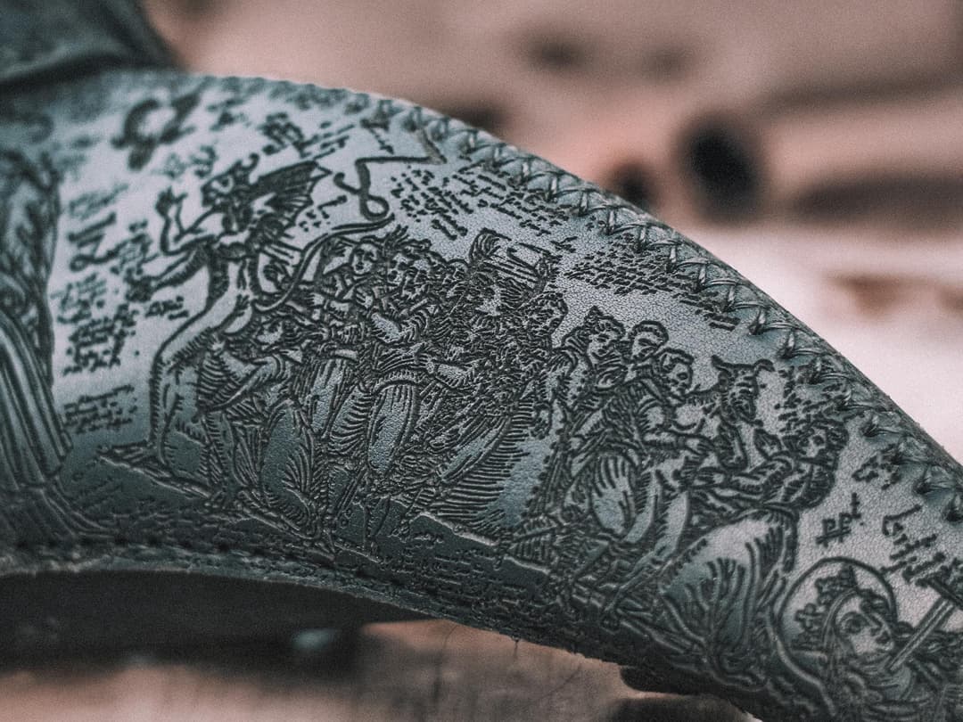 The mask is handmade from vegetable-tanned leather. Each stage – from cutting to the final wax treatment – was completed with long-term perception in mind. The engraving was applied densely, with careful detailing. This piece is constructed as a system of signs open to interpretation. It offers no single reading – only structure and rhythm, inviting the viewer to slow down and study. Every visual element is part of a completed form.