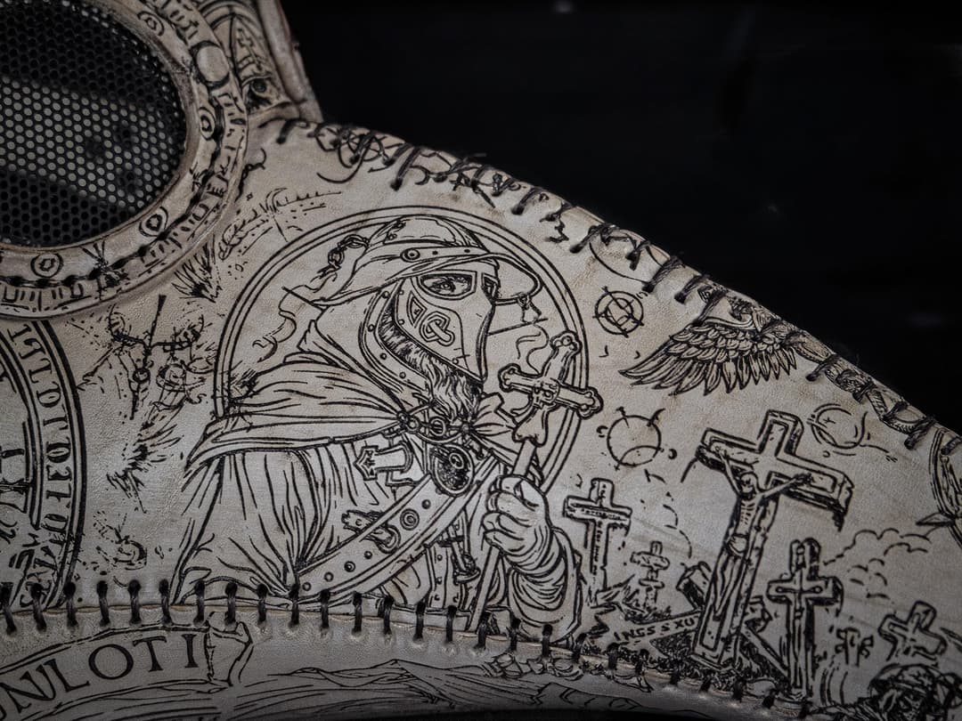 The mask created in response to this figure mirrors that internal structure. Its composition follows iconographic principles of the late 17th century – prayer, act, conclusion. At the center is a female figure with joined hands – a sign of intercession. Below stands the physician, facing a burial ground, and further still, the same figure shown as skeletal. Each element belongs to a vertical system. None stands apart. Each supports a vision of duty that continues beyond the body’s end.