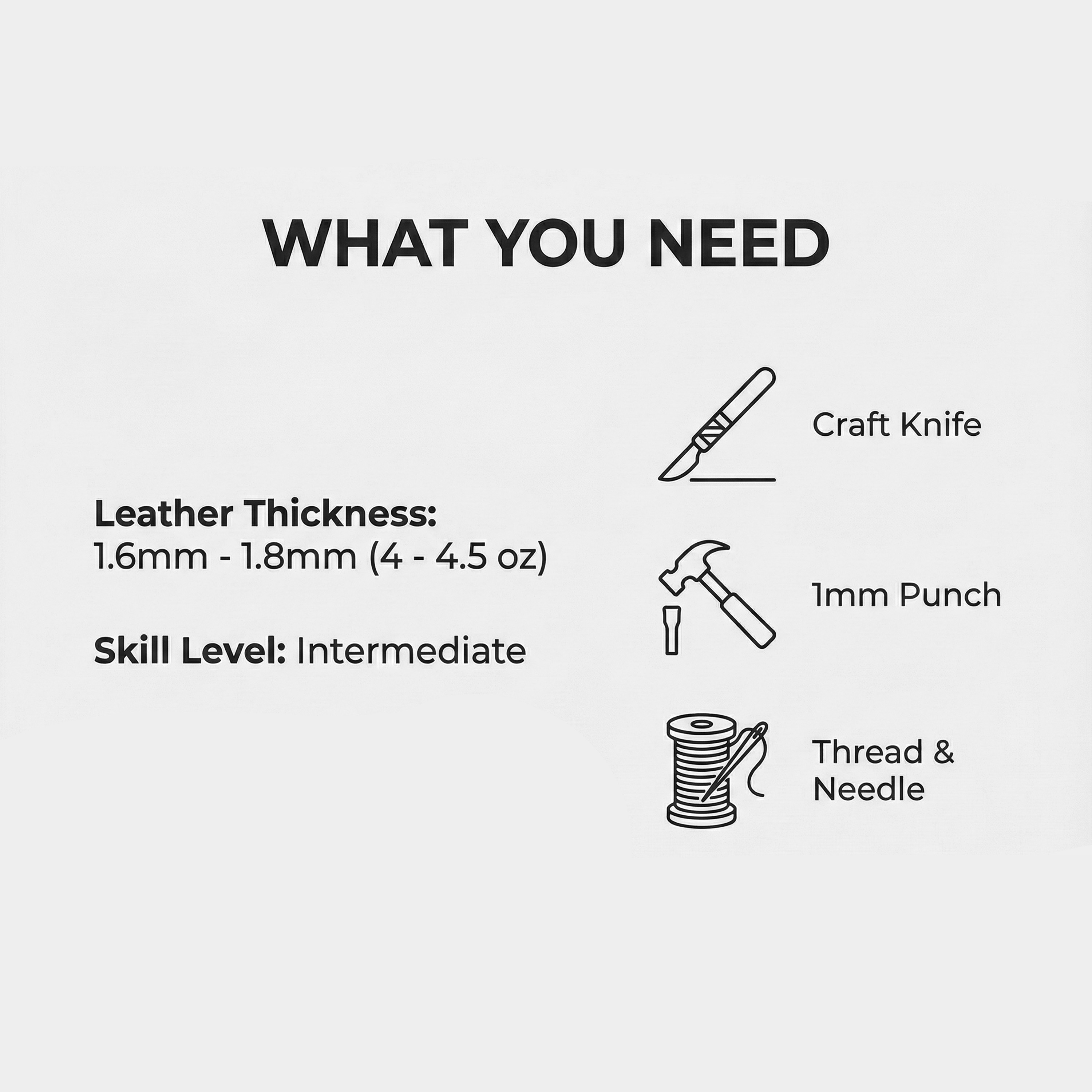 Recommended Leather Thickness: 1.6 mm - 1.8 mm (approx. 4-4.5 oz)
