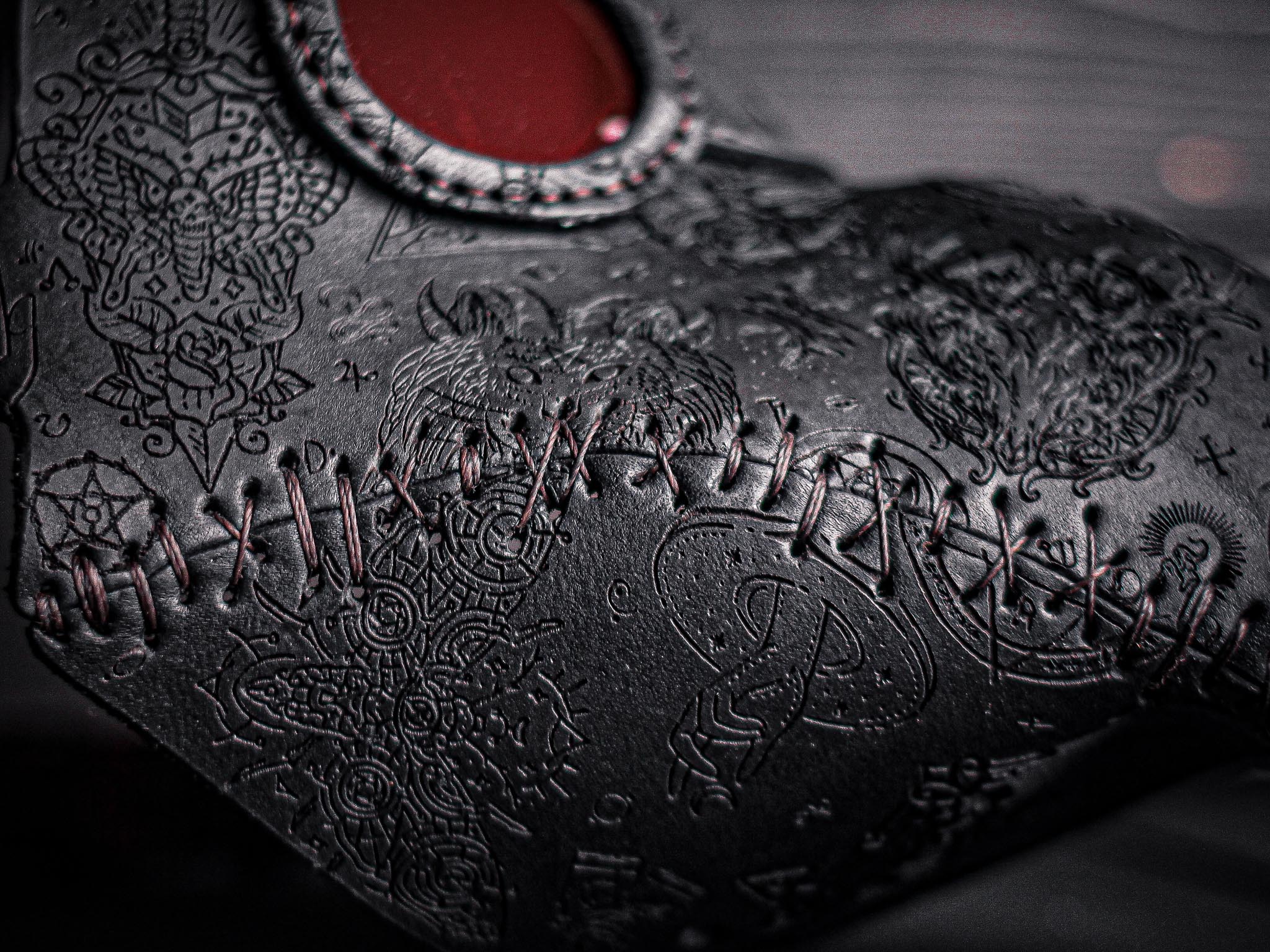 The leather is dense, richly textured, and well-suited for hand-shaping. After engraving, the surface was treated with wax and pigments to deepen the sense of age and dimension. Every stage - from leather selection to final toning - was completed by hand.