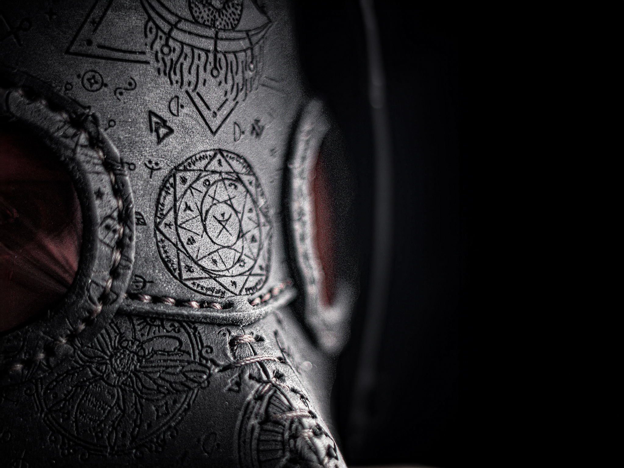The entire surface of the mask is covered with engraving - alchemical diagrams, magical circles, and portraits inspired by myths of witches. These images do not illustrate a specific legend - they convey the spirit of hidden knowledge passed through symbol. Special attention is given to the central element - the third eye, positioned precisely at the forehead when the mask is worn. This symbol reflects the idea of inner vision, a shift from observation to understanding.
